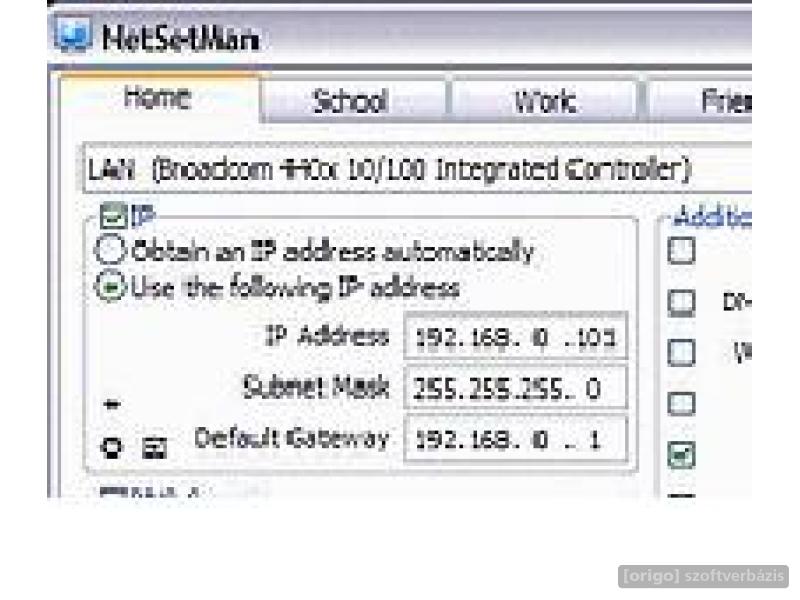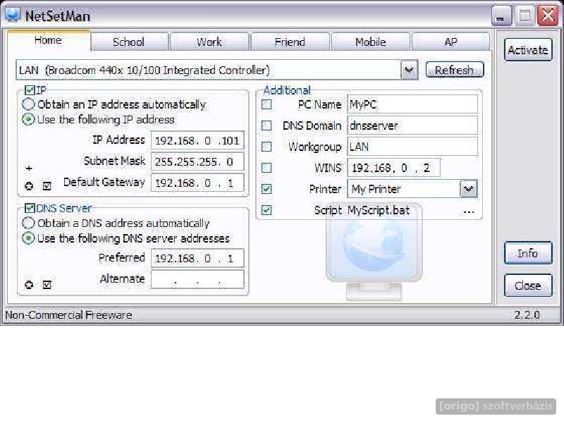Hálózati beállítások módosítása, menedzselése lehetséges az ingyenes szoftverrel. A program hat beállítási lehetőséget biztosít: IP Address, Subnet Mask, Default Gateway, Preferred & Alternate DNS Server, Computer Name, Workgroup, DNS Domain, WINS Server, Default Printer, Run Scripts .